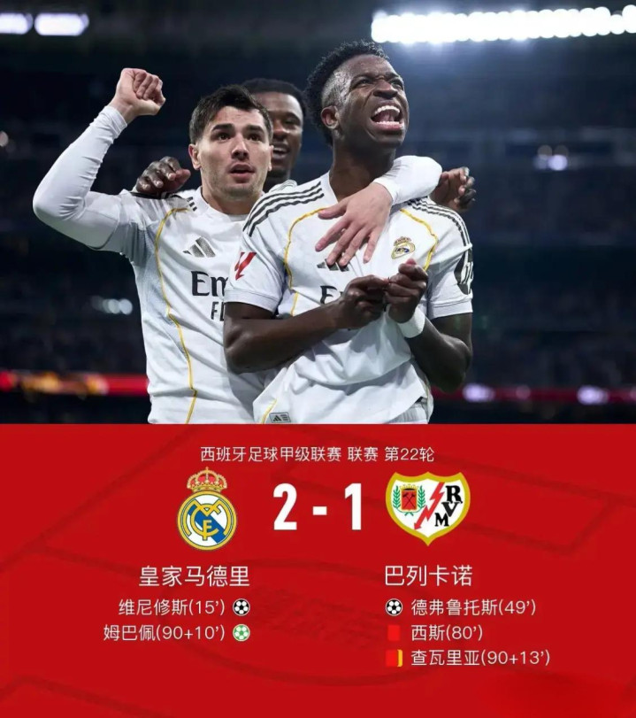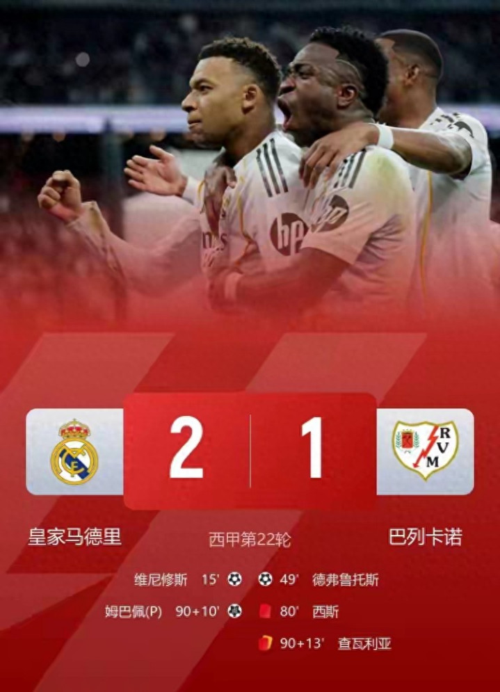 北京时间2026年2月1日晚,西甲第22轮焦点战在伯纳乌球场打响,皇家马德里主场迎战巴列卡诺。经过长达14分钟的伤停补时,皇马凭借姆巴佩在第100分钟的点球绝杀,才以2-1险胜对手。